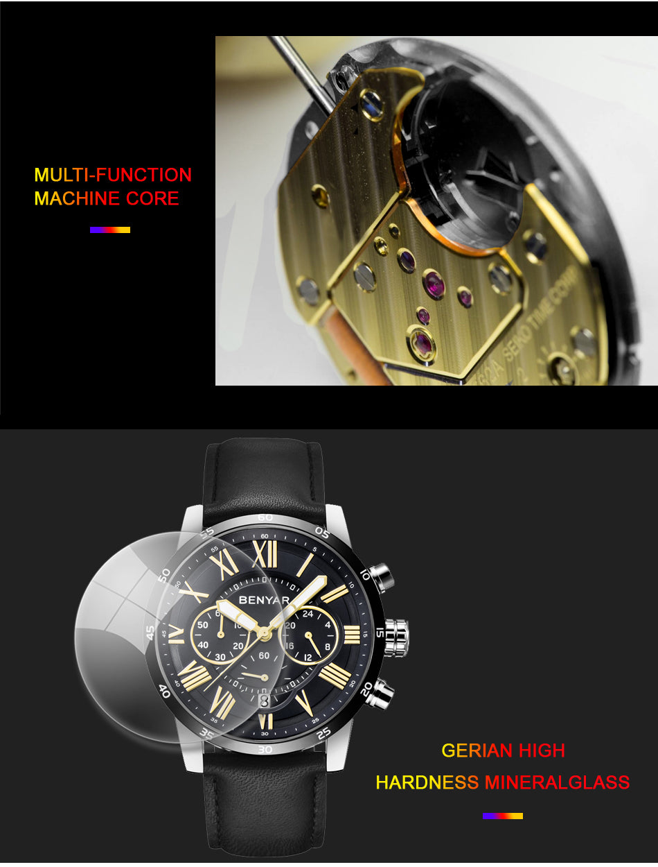 BENYAR 5139 Men's Fashion Multi function Blue Quartz Watch with Genuine Leather Strap