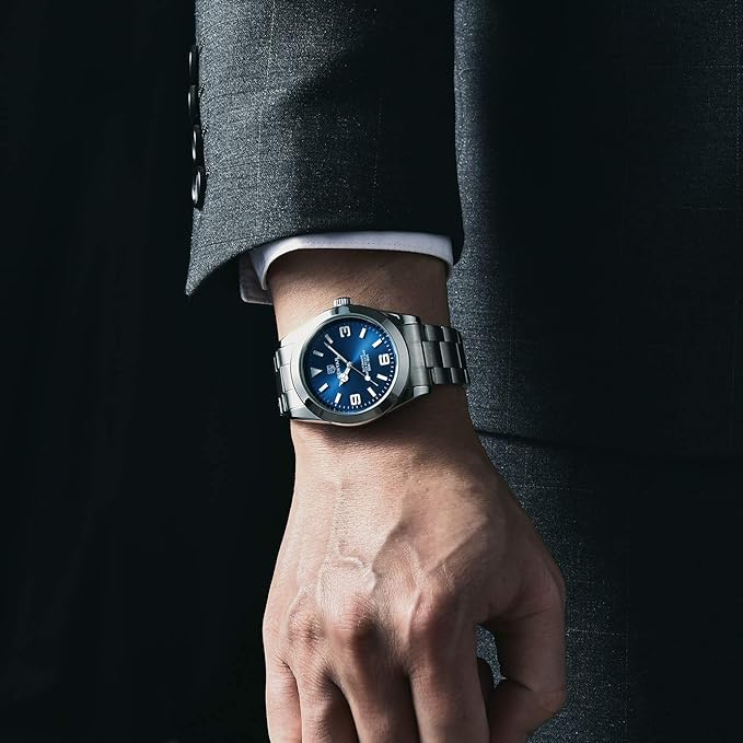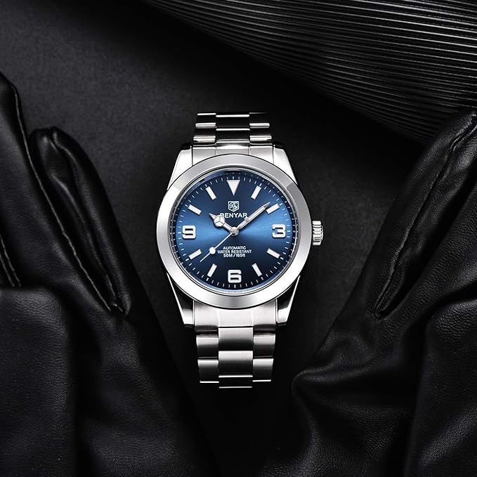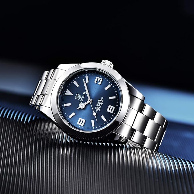 Discover the perfect blend of modern design and classic style with this men's watch featuring a striking blue sunburst dial. The oversized Arabic numerals for 3, 6, and 9, combined with the sleek Binz hands, create a sophisticated and contemporary look. The large three-hand design with luminescent hour markers and hands ensures clear and accurate time reading, even in low light.