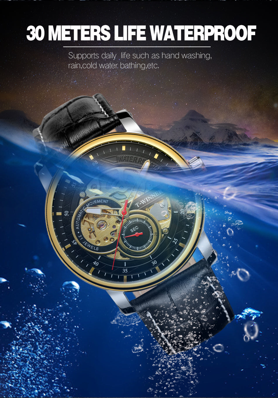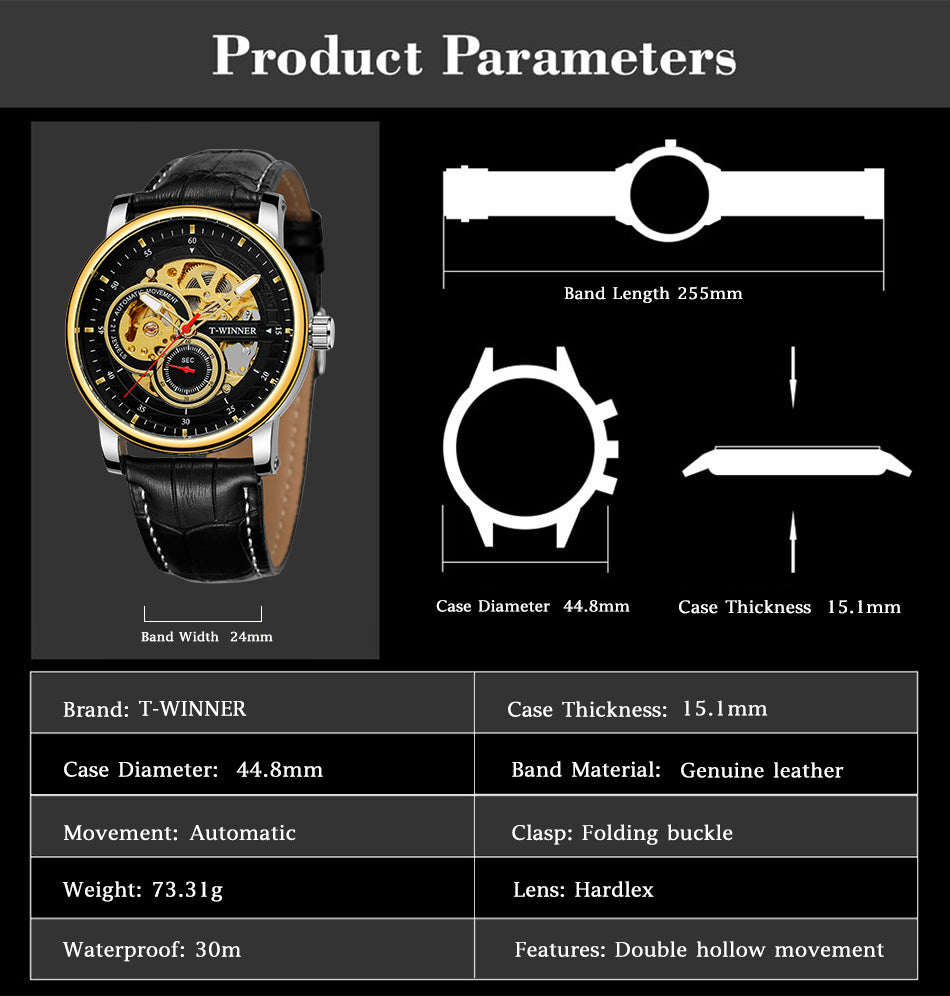 Skeleton Watch Design: A stunning mechanical hollow design, offering a glimpse into the inner workings of the watch. The latest elegant and stylish design gives you a luxury experience like no other. Perfect for both business and dress occasions.