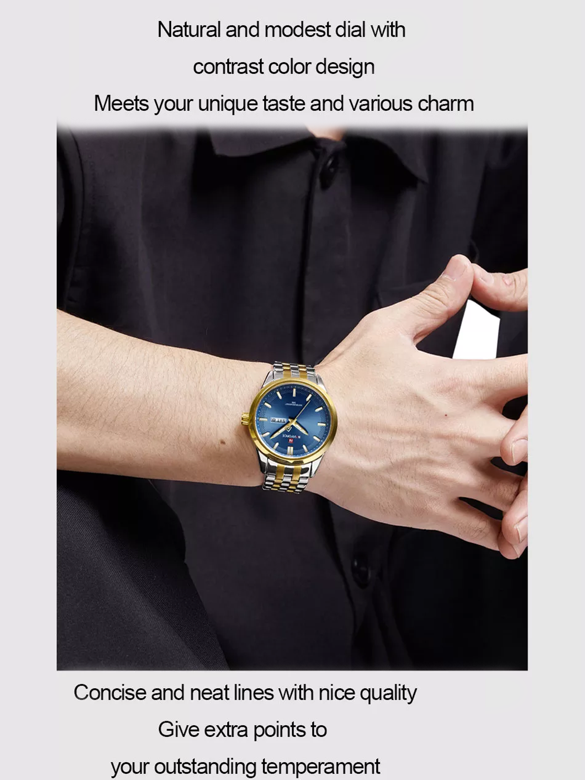 Multi-Function Design: Featuring a day-date calendar display, luminous pointers, and scale design, this watch allows you to easily read the time even in low light conditions.